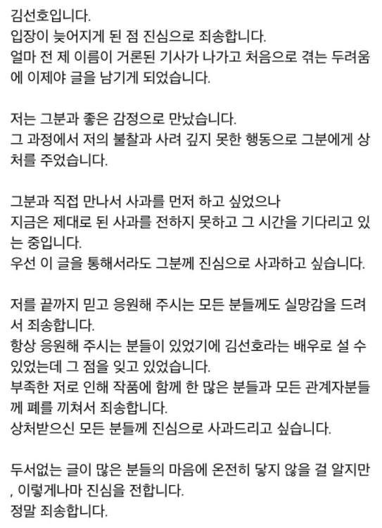 김선호의 공식 입장문을 살펴보면 "자신의 이름이 거론된 기사가 나가고 처음으로 겪는 두려움에 이제야 글을 남기게 되었습니다"라며 입장 표명에 늦은 이유에 대한 언급으로 시작합니다. 그리고 이어 김선호는 "그 분과 좋은 감정으로 만났고 그 과정에서 저의 불찰로 사려 깊지 못한 행동으로 그분에게 상처를 주었습니다. 그분과 직접 만나서 사과를 먼저 하고 싶었으나 지금은 제대로 된 사과를 전하지 못하고 그 시간을 기다리고 있는 중입니다. 우선 이 글을 통해서라도 그분께 진심으로 사과하고 싶습니다"라며 사과의 뜻을 전하기도 했습니다.