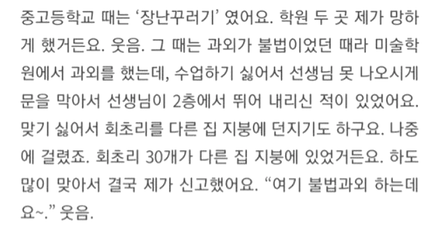 중고등학교 때는 '장난꾸러기'였어요. 학원 두 곳을 제가 망하게 했거든요. 그 때는 과외가 불법이었던 때라 미술학원에서 과외를 했는데 수업하기 싫어서 선생님 못 나오시게 문을 막아서 선생님이 2층에서 뛰어 내리신 적이 있었어요. 맞기 싫어서 회초리를 다른 집 지붕에 던지기도 하구요. 나중에 걸렸죠. 회초리 30개가 다른 집 지붕에 있었거든요. 하도 많이 맞아서 결국 제가 신고했어요. "여기 불법과외 하는데요~"(웃음)